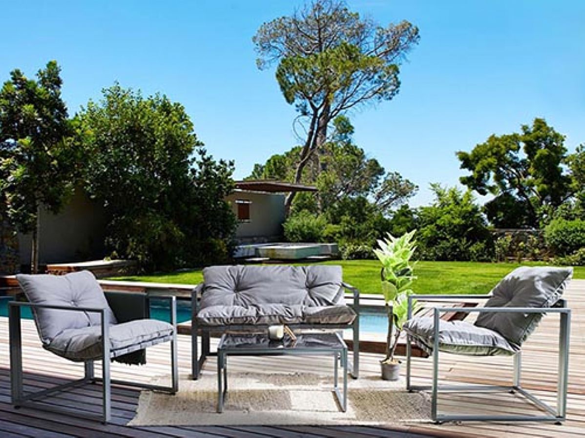 If simplicity is your preference, this set is ideal for you. The set consists of a 2 seater sofa, 2 single sofas, and a coffee table. While the furniture set features a simple modern look, you can still pair it with different aesthetics and decorative styles to give your patio a unique look. Each piece is made using high-quality aluminum tubing while the sofas are paired with ultra-comfortable gray cushions.