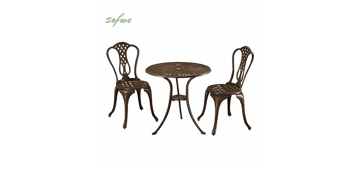 - This three-piece outdoor eating set includes a tiny round table and two matching chairs. The bistro set is composed of exceptionally tough cast aluminum, greatly increasing its durability. The materials require little upkeep and are simple to clean with a dry or damp towel.