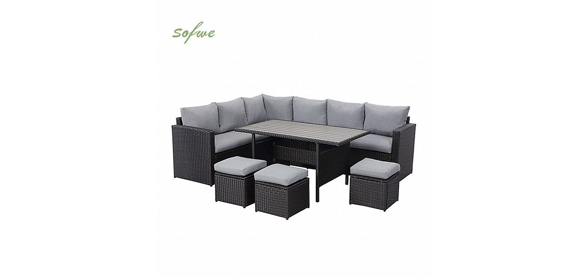 The 7-piece rattan sofa set includes 3 two-seater chairs, 3 ottomans, and 1 rectangle table—which can be arranged freely according to your space needs.
